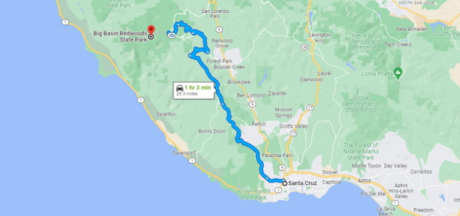 The park is about an hour's drive north of Santa Cruz. If you're driving the Pacific Coast Highway it will mean a diversion inland, and then returning to the coast. In distance it's only about 25 miles (40 kms) but the roads are slow, climbing, and winding.