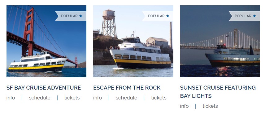 Also on Fisherman's Wharf at Pier 43½ are the Red and White Fleet with Golden Gate Bay Cruises, California Sunset Cruises, and others. Boat trips around the bay are among the most popular of San Francisco sightseeing tours, and rightly so. Don't miss it.
